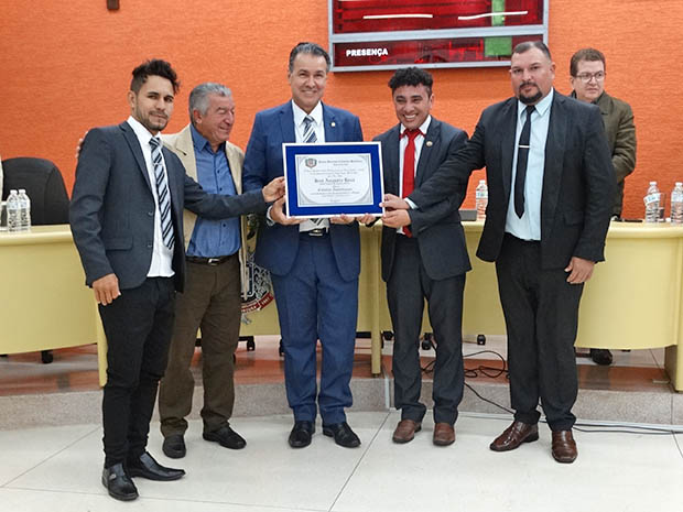 Vereador Van do Gás, Prefeito Dirceu, Capitão Augusto, vice-prefeito Luzimar e opresidente Zé Roberto durante entrega de título. (Imagem: Denílson Lopes)